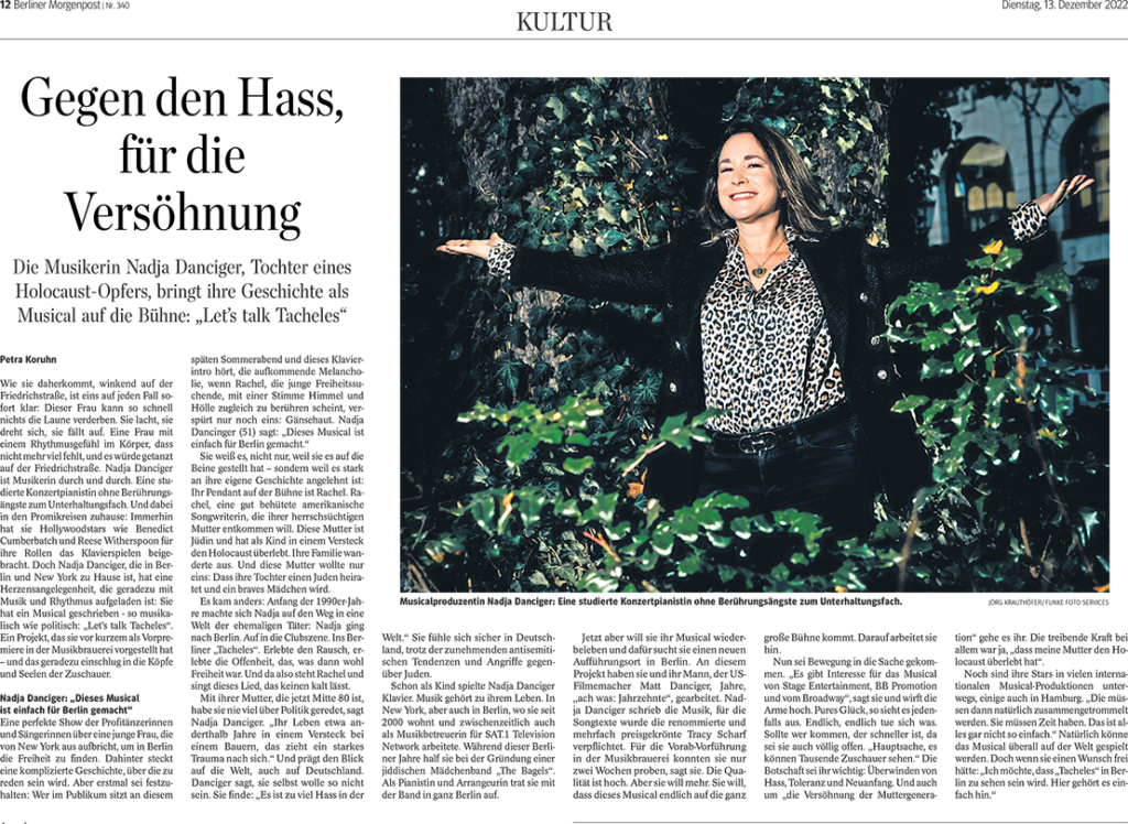 Our musical and Nadja Danciger (story & music), were featured in a half-page spread in Berlin’s premier daily paper, the Berliner Morgenpost. After attending our July 4, 2022 workshop, cultural journalist Petra Koruhn conveyed to us her desire to support such an important and timely production. She writes: “A perfect show … as musical as it is political … which virtually struck a chord in the minds and souls of the audience … Everyone sitting here on this late summer evening hearing that piano intro, the rising melancholy when Rachel, the young freedom seeker, seems to touch heaven and hell at the same time, feels only one thing: goosebumps.” (Translated from German)